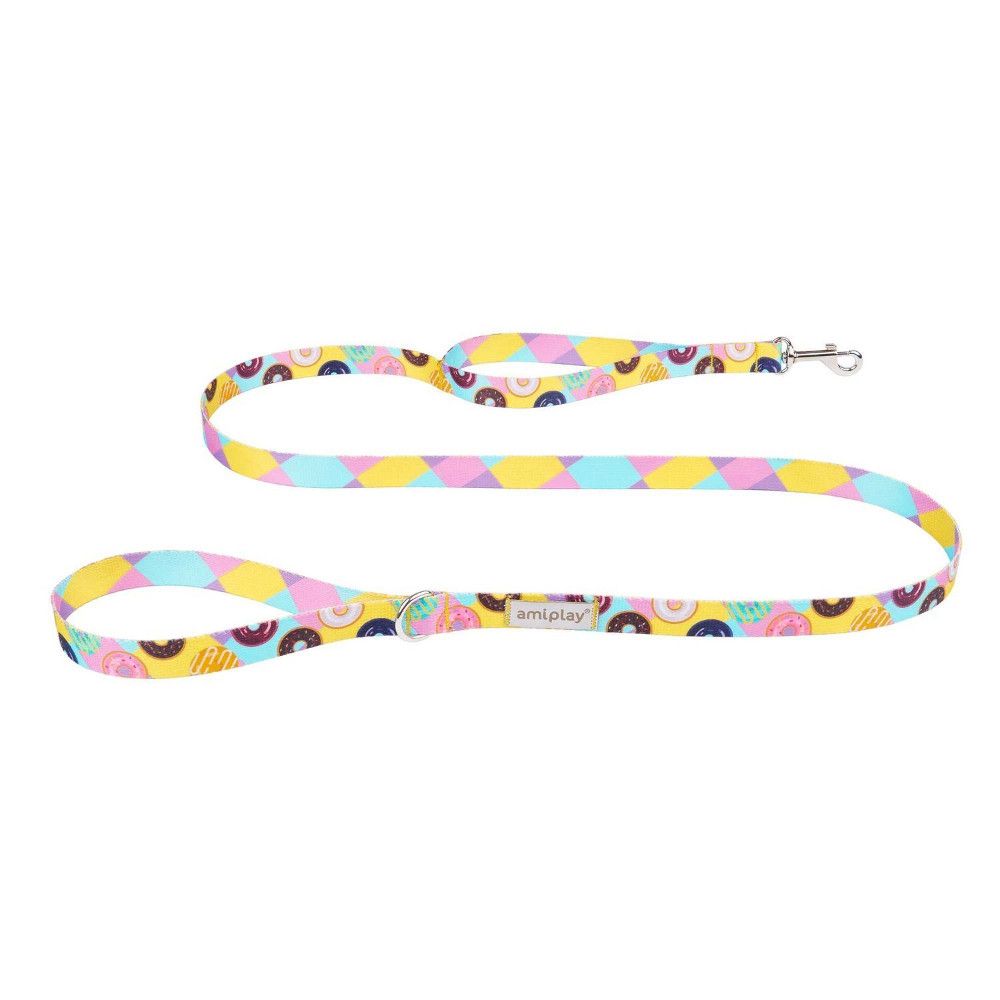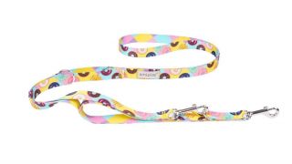 Smycz wykonana z solidnej taśmy, odpornej na warunki atmosferyczne o niezwykle radosnej kolorystyce. Zastosowana taśma jest bardzo łatwa w czyszczeniu, wystarczy przetrzeć ją wilgotną szmatką lub wyprać, gdy zajdzie taka potrzeba i znów jest gotowa do użycia. Wygodna rękojeść zapewnia dużą pewność prowadzenia psa. Przy uchwycie znajduje się oczko służące do wygodnego przypięcia pojemnika na woreczki.