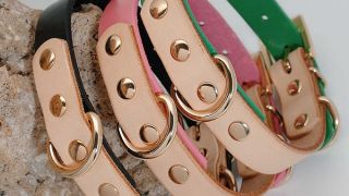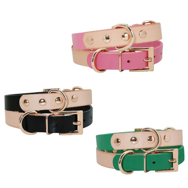 Bardzo ciekawy design, połowa obroży w naturalnym jasno brązowym kolorze a druga w różowym lub zielonym.