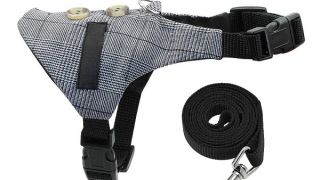 Szelki wykonane z miękkiego i przyjemnego materiału ze smyczą w zestawie. Materiał w szarą kratę, zdobiony dwoma guzikami pięknie prezentuje się na każdym psie.