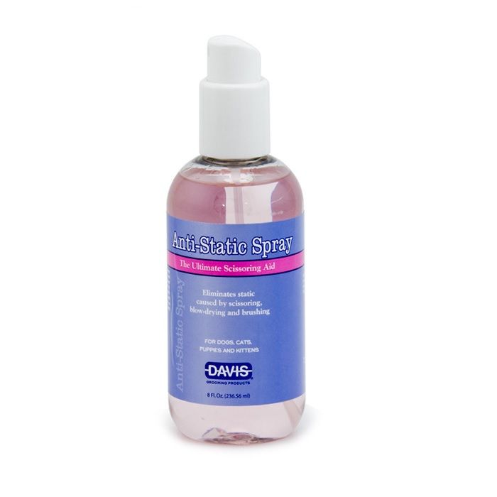 Antystatyczny spray dla psów i kotów Davis Anti-Static Spray sprawia, że sierść staje się posłuszna i przestaje się elektryzować podczas strzyżenia nożyczkami, suszenia suszarką oraz czesania.