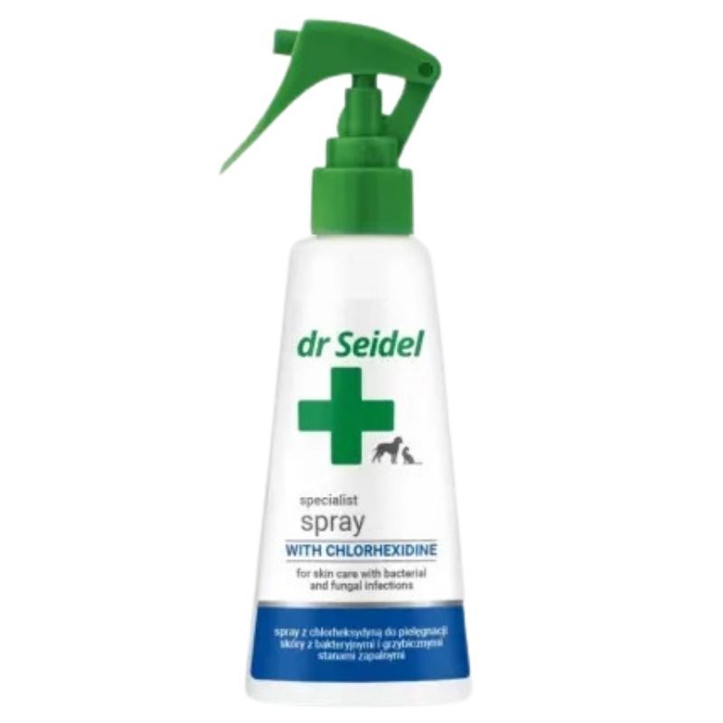 Spray dr Seidla z chlorheksydyną jest doskonałym preparatem pielęgnacyjnym do stosowania w czasie terapii stanów zapalnych skóry wywołanych: zakażeniami bakteriami gram-dodatnimi i gram-ujemnymi, zakażeniami grzybiczymi (w tym drożdżaki), zaburzeniami wywołanymi nadwrażliwością i w dermatozach zależnych od hormonów. Ze względu na dwubiegunową budowę cząsteczkową, chlorheksydyna wykazuje przedłużone działanie. Spray nie podrażnia skóry.