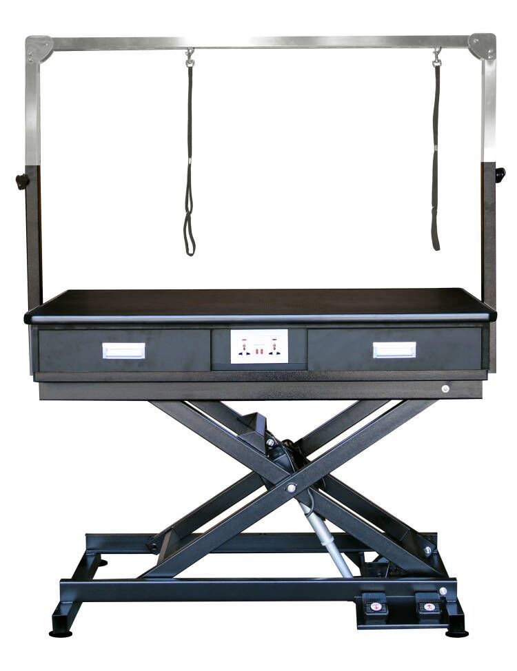 Wbudowane gniazdo zasilające pozwala podłączyć maszynkę groomerską bezpośrednio do stołu, a dwie praktyczne szuflady zapewniają dodatkowe miejsce na akcesoria. Dzięki podwójnemu wysięgnikowi stół jest w pełni funkcjonalny i dostosowany do pracy z psami różnej wielkości.