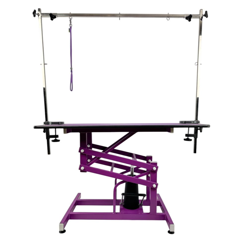 To wyjątkowo stabilny stół z blatem pokrytym antypoślizgową matą w kolorze fioletowym, która zapewnia bezpieczeństwo zwierzętom podczas pracy.