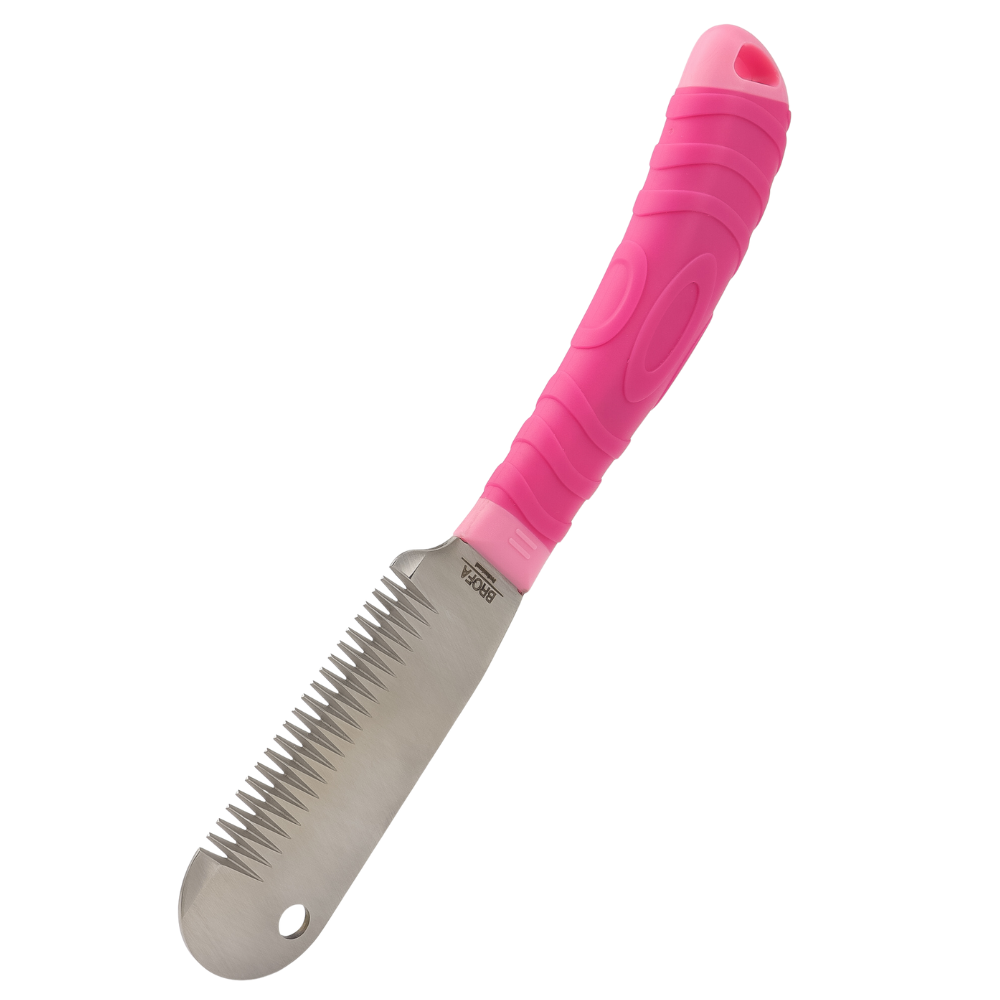 Stripping Knife Brofa Medium/Coarse to duży nóż trymerski zaprojektowany do wydajnej pracy przy sierści szorstkiej. Rzadsze, wyraźnie zaznaczone zęby umożliwiają sprawne usuwanie martwego włosa okrywowego, szczególnie na większych powierzchniach.