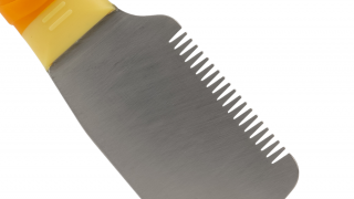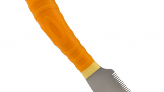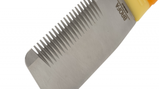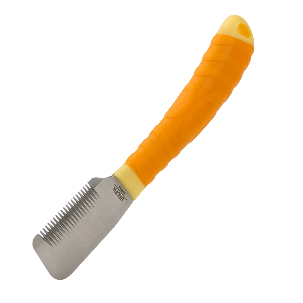 Stripping Knife Brofa Medium/Coarse to praktyczny nóż trymerski do ręcznego trymowania sierści szorstkiej. Wersja z dłuższą częścią metalową i wyraźnymi zębami sprawdza się przy sprawnym usuwaniu martwego włosa okrywowego na większych partiach ciała.