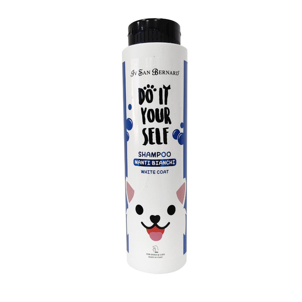 Iv San Bernard Do It Your Self, White Shampoo (Manti Bianchi) - szampon eliminujący żółte plamy na białej sierści i rudawe plamy na czarnej sierści psów i kotów. Ma delikatne działanie czyszczące. Nie podrażnia skóry i nie uszkadza włosa. Nie zawiera substancji utleniających.