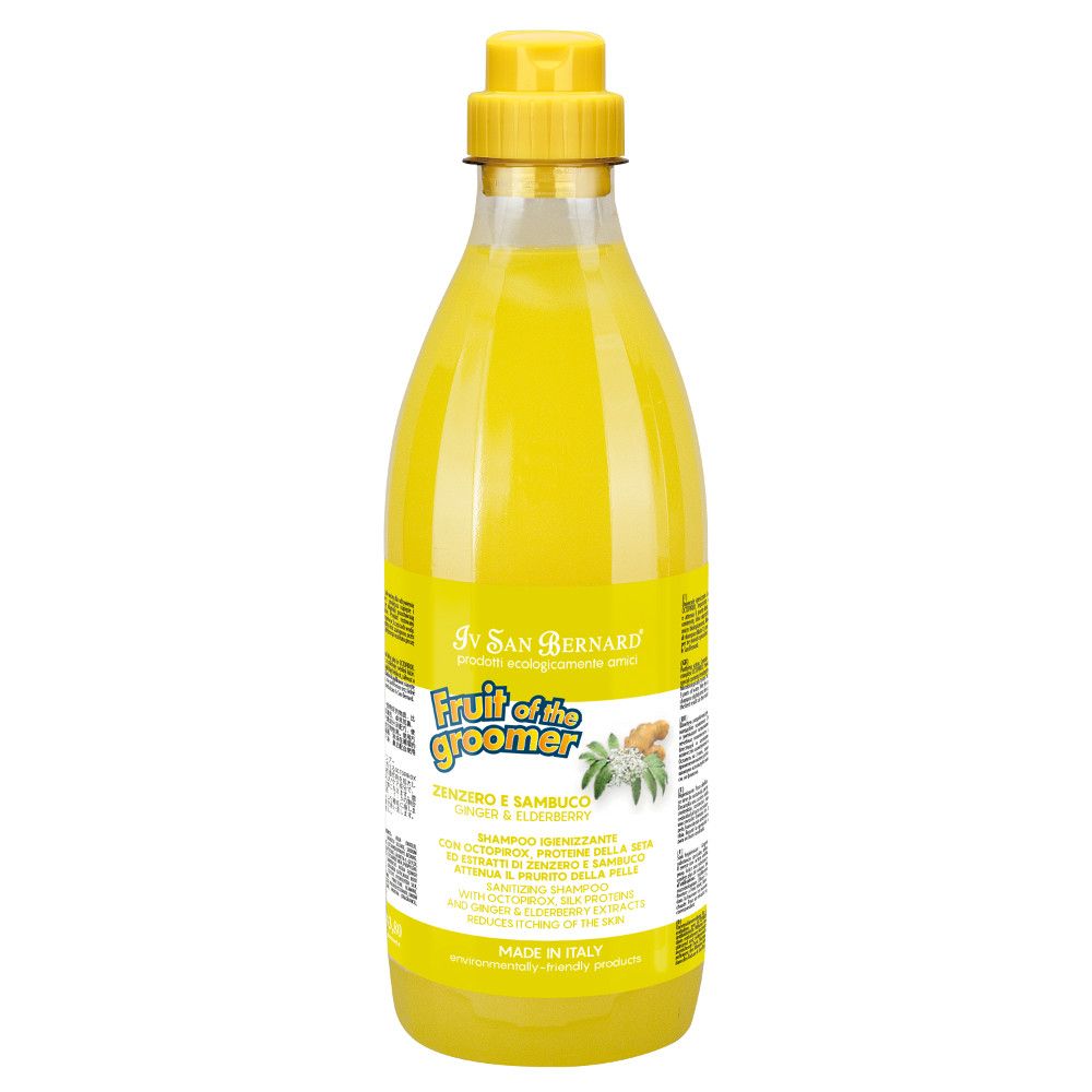 Iv San Bernard Fruit of the Groomer Ginger & Elderberry to wyjątkowy szampon dla psów i kotów, wykazujący silne działanie oczyszczające oraz zmniejszające swędzenie i podrażnienie skóry.
