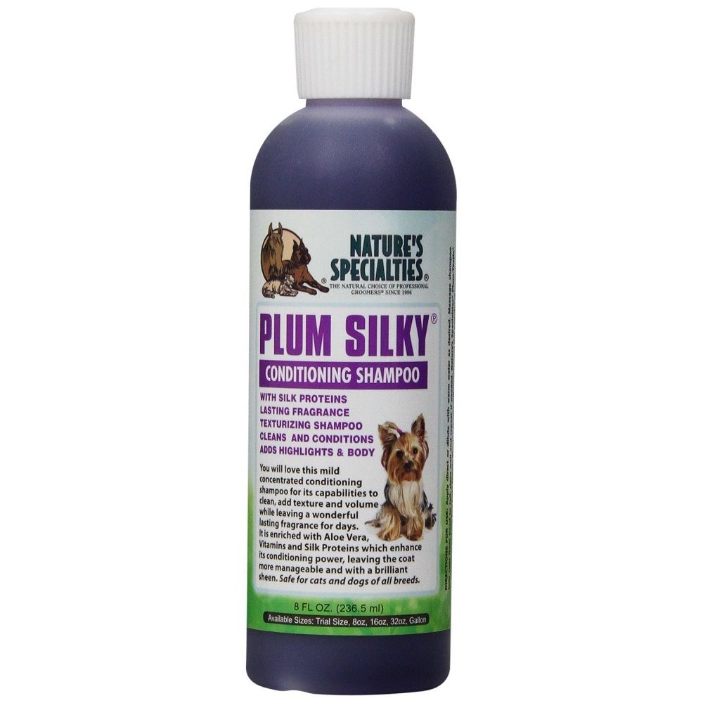 Łagodny szampon Plum Silky firmy Natures Specialties wysoko skoncentrowany, doskonale czyści, wygładza, utrzymuje odpowiednią teksturę sierści.