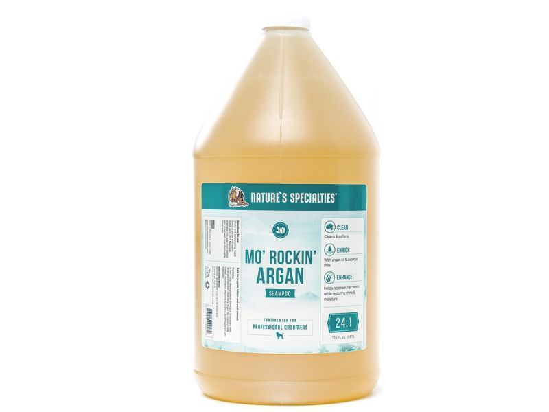 Szampon Mo ’Rockin’ Argan łączy w sobie marokański olej arganowy i ekstrakt z mleka kokosowego w bazie szamponu bez siarczanów, aby odżywić sierść, poprawiając zdrowie włosów i przywracając wspaniały połysk. Bogaty w przeciwutleniacze, witaminy i kwasy tłuszczowe, olej arganowy wzmacnia włosy, co ogranicza łamliwość i rozdwajanie się końcówek, wygładza puszenie się i rewitalizuje sierść.