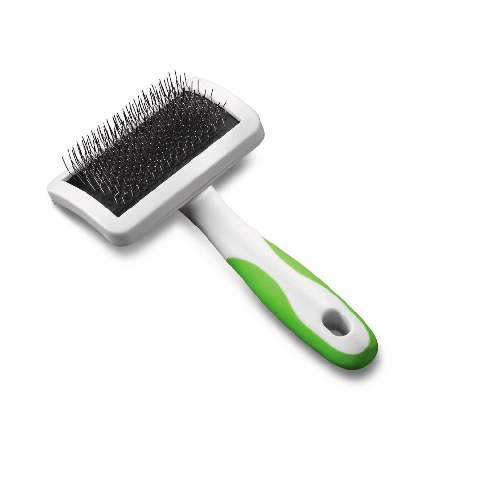 Szczotka do czesania psów i kotów, posiada długie, zakrzywione włosie ze stali nierdzewnej, które bezpiecznie i delikatnie wnika w podszerstek, usuwając kołtuny, zanieczyszczenia i luźne włosy. Jest skuteczna w usuwaniu kołtunów i zmniejszaniu wypadania, nawet w przypadku grubej sierści, dzięki idealnie ustawionym szpilkom.
