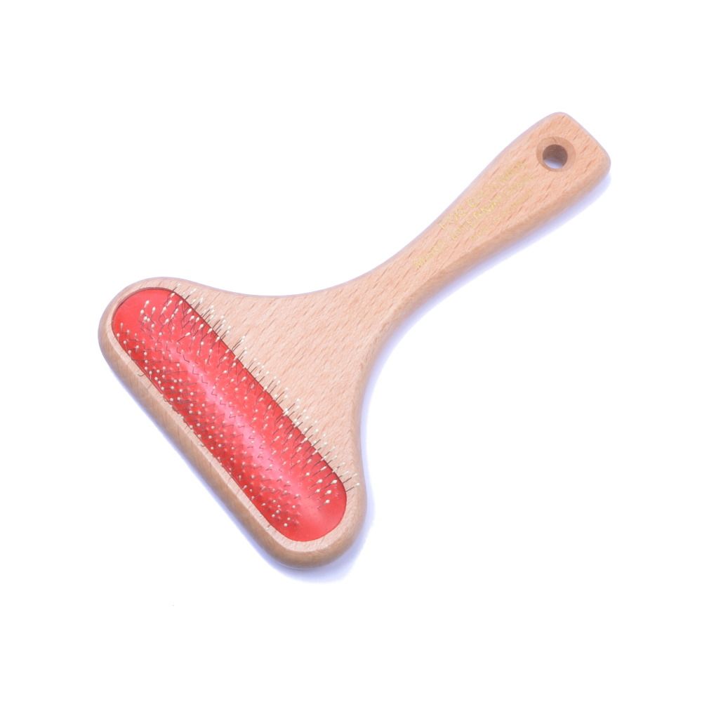 Solidna konstrukcja z drewna zapewnia trwałość i wygodę użytkowania, a metalowe igiełki zakończone bezpiecznymi kulkami delikatnie rozczesują sierść, nie podrażniając skóry.