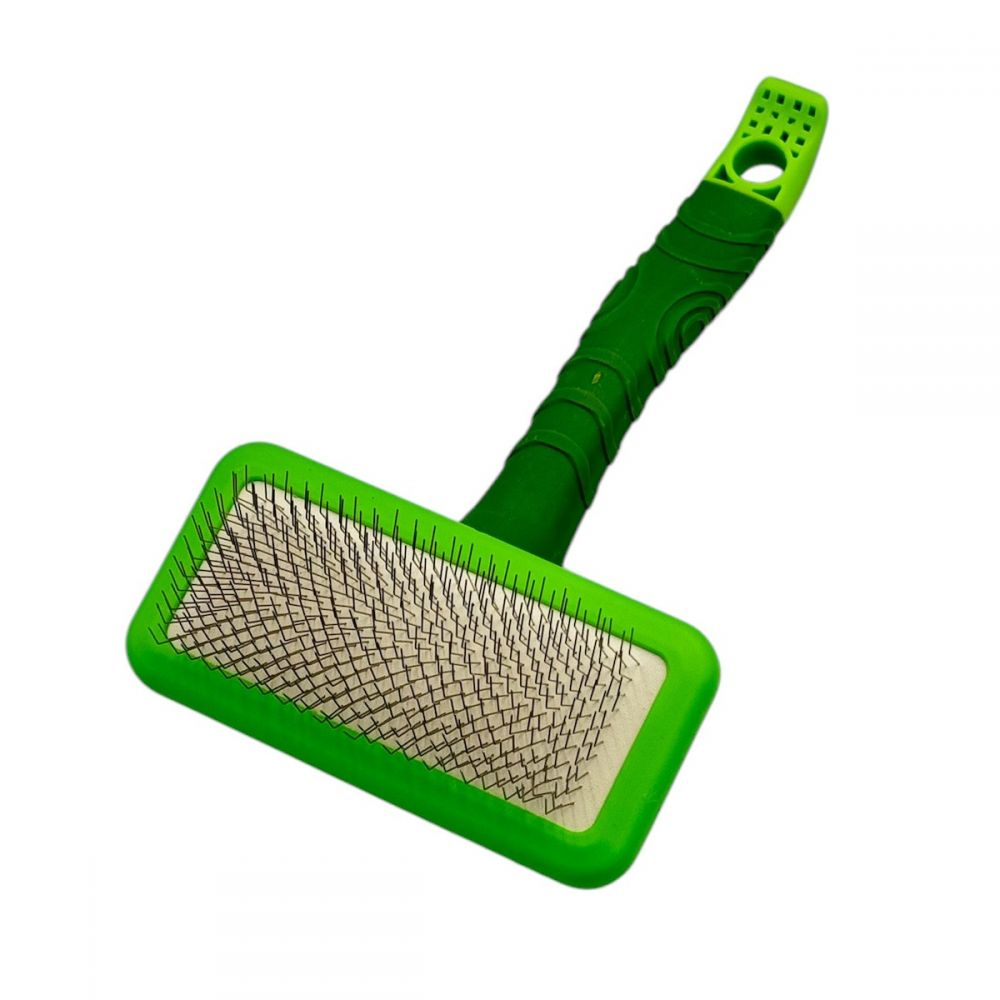 Miękka szczotka to niezastąpione narzędzie w salonie groomerskim lub w domowym zaciszu. Nadaje się do utrzymywania sierści psów i kotów wolnej od kołtunów, luźnej i pełnej objętości. Dzięki elastycznym szpilkom rozdziela pasma włosów bez uszkadzania skóry zwierzęcia.