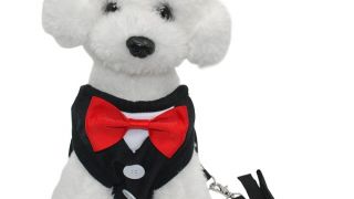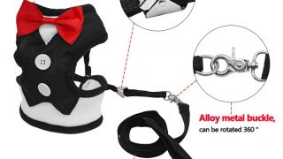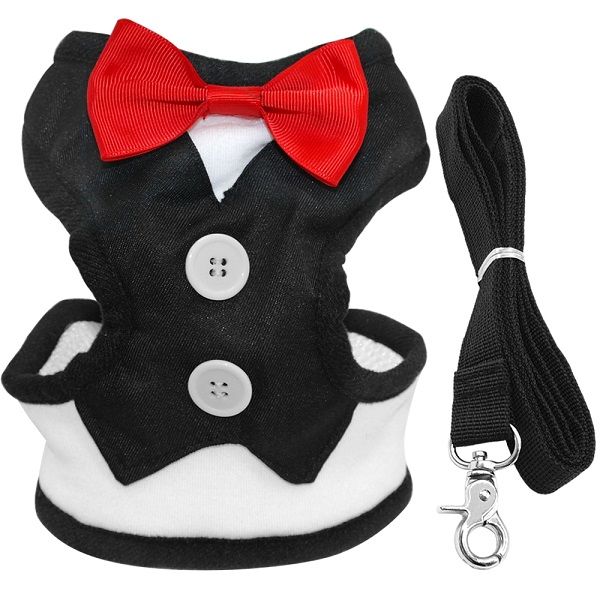 Miękkie, wygodne, podszyte oddychającą siateczką. Szelki mają modny wzór smokingu, ozdobione czerwoną kokardką i białymi guzikami. Szelki i smycz polecamy dla małych i średnich psów.