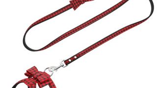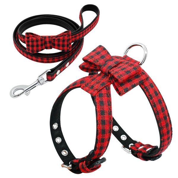 Komplet szelek ze smyczą w elegancką czerwono czarną kratę, smycz dodatkowo ozdobiona kokardą - muszką, polecamy dla małych psów.