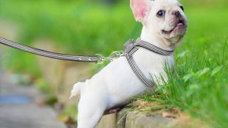 Komplet szelek ze smyczą w eleganckie czarno białe pasy, smycz dodatkowo ozdobiona kokardą - muszką, polecamy dla małych psów.