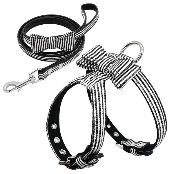 Komplet szelek ze smyczą w eleganckie czarno białe pasy, smycz dodatkowo ozdobiona kokardą - muszką, polecamy dla małych psów.
