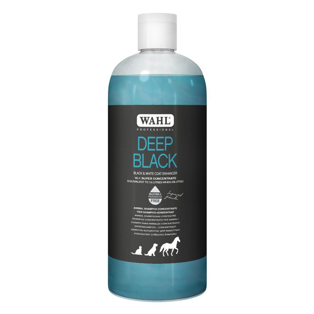 Wahl Deep Black to szampon oparty na naturalnych składnikach, zaprojektowany specjalnie w celu intensyfikacji i podkreślenia czarnego i ciemnego koloru sierści. Formuła nie zawiera szkodliwych detergentów ani środków czyszczących, a składniki takie jak ekstrakty z brzoskwini, gruszki, passiflory oraz kiwi przynoszą doskonałe rezultaty dla czarnej sierści.