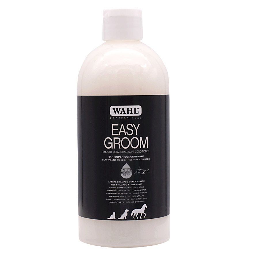 Wahl Easy Groom Conditioner to odżywka oparta na naturalnych składnikach, nie zawiera szkodliwych detergentów i środków czyszczących. Formuła jest doskonale wyważona i zawiera witaminę E, która delikatnie wzbogaca, nawilża i chroni włosy po kąpieli, ułatwiając jednocześnie rozczesywanie.