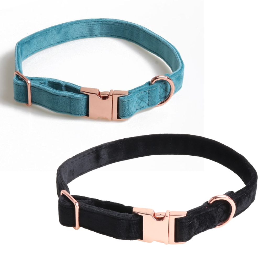 Obroża dla psa wykonana jest z przyjemnego w dotyku materiału-weluru, w pięknym turkusowym lub czarnym kolorze. Posiada mocne, wytrzymałe, metalowe elementy w kolorze złota.