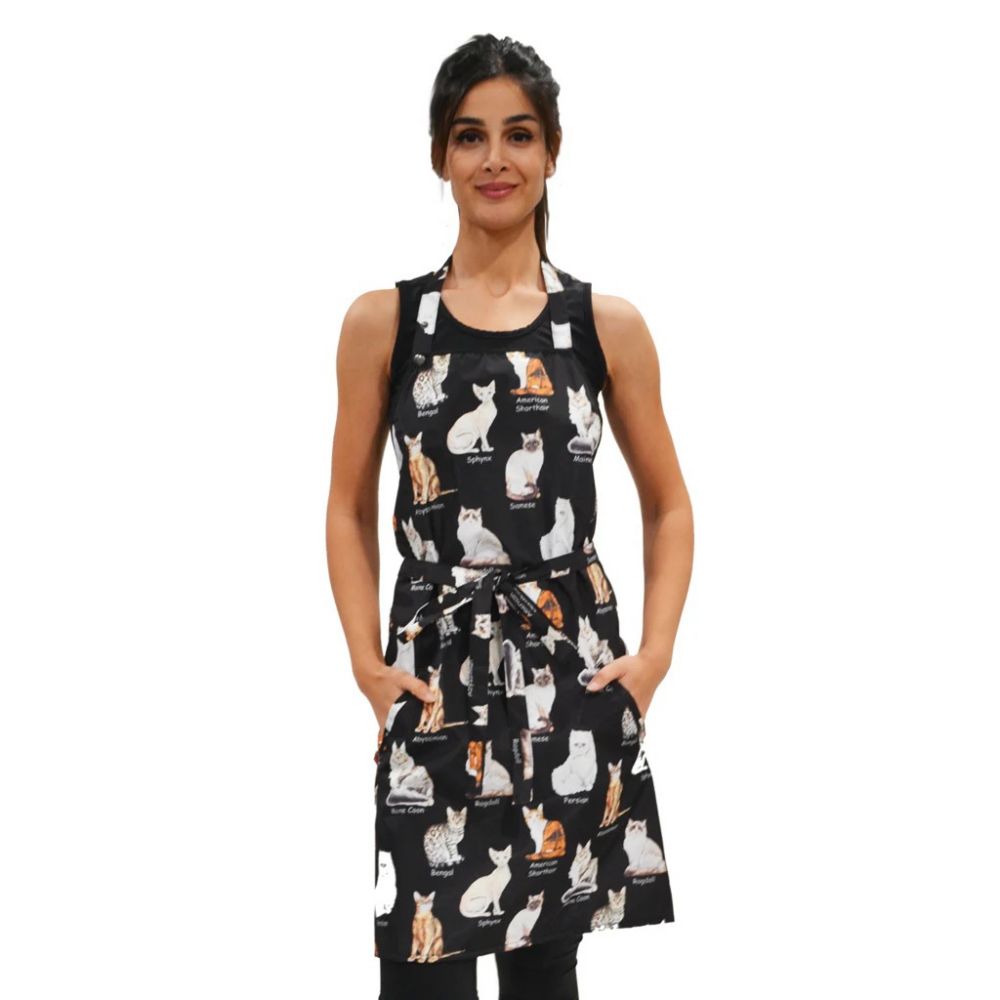 Kolorowy wodoodporny fartuch groomerski "Catty Groomer" z motywami kotów – idealny dla miłośników zwierząt! Ekskluzywny wzór prezentuje 8 popularnych ras kotów, od Maine Coon po American Shorthair, w żywych, portretowych stylizacjach.