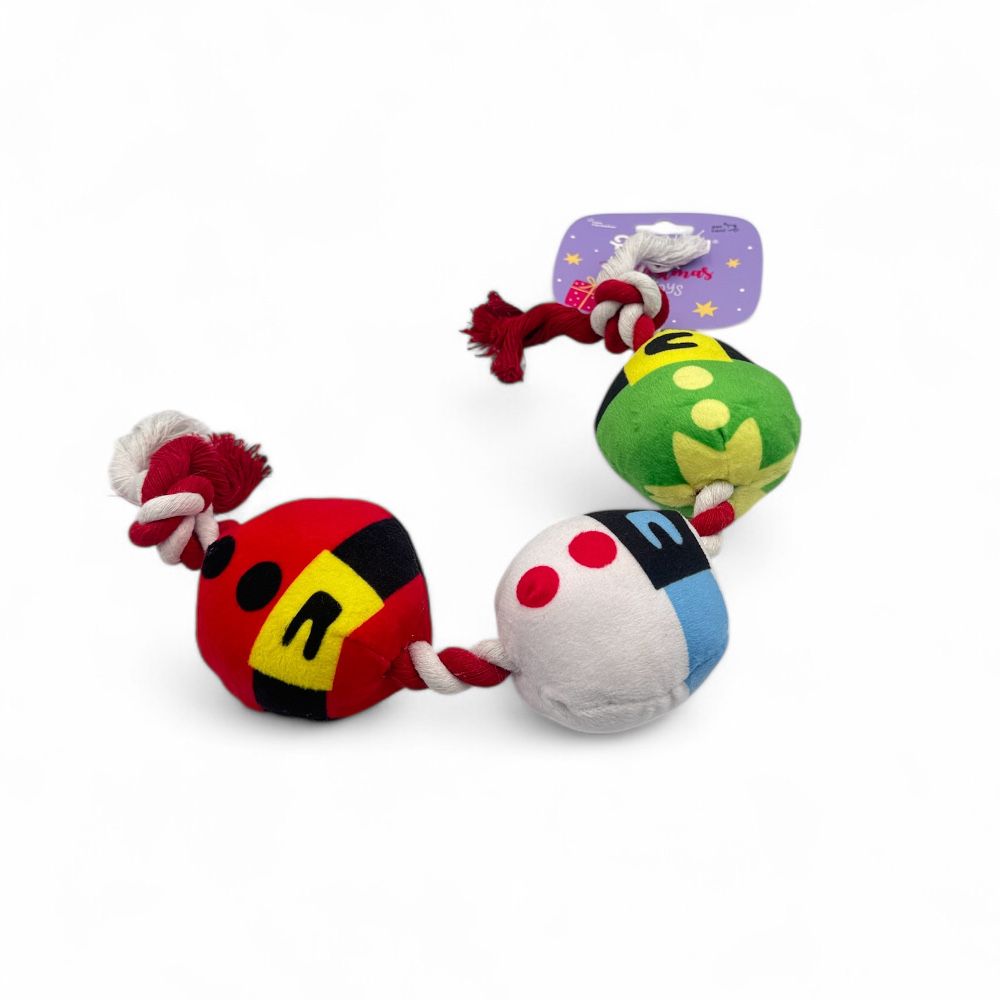 Kolorowa pluszowa zabawka dla psów, która zapewni świetną rozrywkę podczas świąt. Każda kulka wyposażona jest w piszczałkę, która dodatkowo stymuluje zainteresowanie psa zabawką.