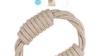 Zabawka dla psa w kolorze beżowym wykonana ze sznurka.