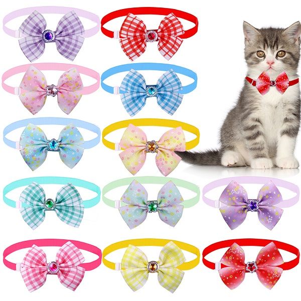 W każdym zestawie znajduje się 5 sztuk kokardek w różnych wzorach i kolorach ozdobionych kolorową cyrkonią. Rozmiar muszki to 5cm na 6,5cm, obwód całkowity obroży ok. 38.