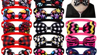 Dodaj swojemu pupilowi odrobinę elegancji i uroku dzięki zestawowi pięciu ozdobnych muszek na tasiemce z kolekcji Elegant.