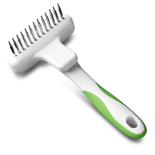 Przemyślana konstrukcja: Ergonomiczny uchwyt z antypoślizgową powłoką zapewnia pewny chwyt i pełną kontrolę podczas szczotkowania. Obrotowe zęby z amortyzacją dostosowują się do kształtu ciała psa, gwarantując bezpieczną i przyjemną pielęgnację.
