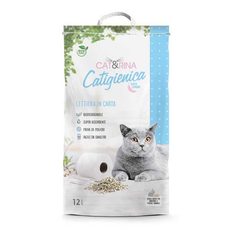 Catigienica to ekologiczny żwirek dla kotów i małych zwierząt, wykonany z czystej, przetworzonej celulozy, łatwy do transportu, ponieważ jest lżejszy od tradycyjnych piasków. Dzięki nadającemu się do recyklingu opakowaniu, żwirek jest w 100% biodegradowalny i ma niski wpływ na środowisko, ponieważ jest produkowany bez wycinania drzew i w procesie przyjaznym dla środowiska, który redukuje emisję szkodliwych gazów.
